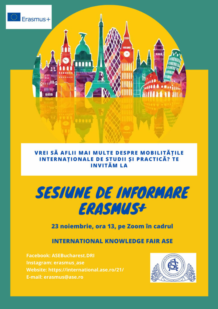 Cu ocazia International Knowledge Fair ASE 2021 Biroul Erasmus+ organizează 2 evenimente de promovare a mobilităților Erasmus+ de studiu și practică adresate studenților 1. Sesiune de informare asupra programului de mobilități Erasmus+ (în limba română) marți, 23 noiembrie de la ora 13. Va include prezentarea tehnică realizată de echipa noastră atât a oportunităților de studiu